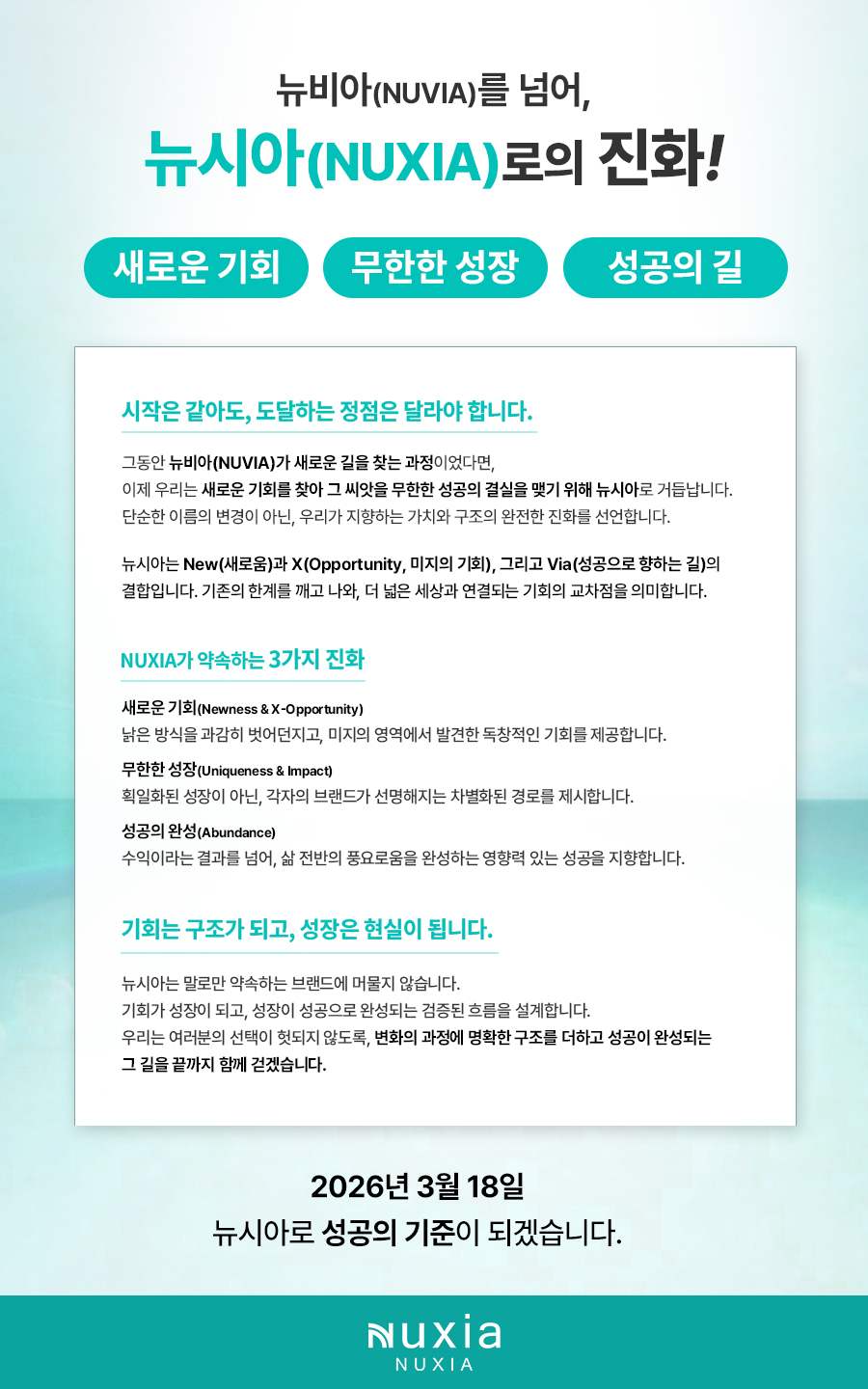뉴비아(NUVIA)가 2026년 3월 18일부터 뉴시아(NUXIA)로 새로 태어납니다.